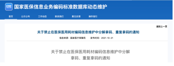 近日,國(guó)家醫(yī)保局發(fā)布《關(guān)于禁止在醫(yī)保醫(yī)用耗材編碼信息維護(hù)中分解拿碼、重復(fù)拿碼的通知》(以下簡(jiǎn)稱《通知》)。內(nèi)容指出:醫(yī)用耗材維護(hù)企業(yè)需于2021年10月31日前,對(duì)已維護(hù)賦碼的耗材產(chǎn)品信息進(jìn)行梳理,對(duì)存在分解拿碼、重復(fù)拿碼情況的數(shù)據(jù)進(jìn)行合并修正、重新提交。逾期未完成修正的,將停用有關(guān)產(chǎn)品編碼。